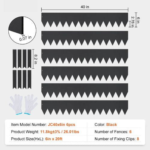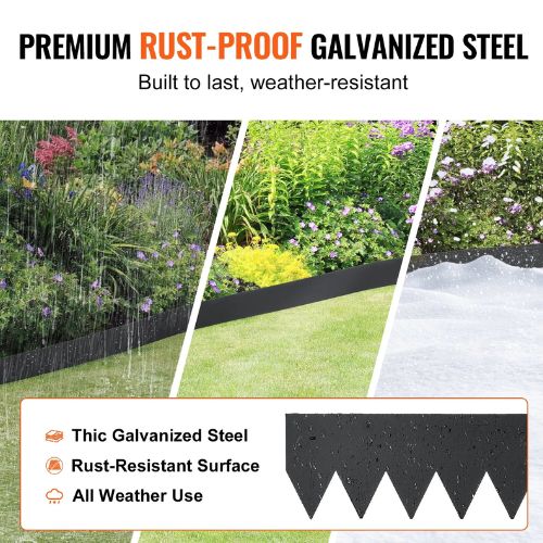 Various Sizes: VEVOR steel landscape edging is available in a set of 6 pieces, each measuring 40x6 inches. It comes with 8 clips for effortless installation. The extended spikes make secure ground anchoring, allowing you to create clean lines and spaces in your lawn. Loved by gardening enthusiasts.