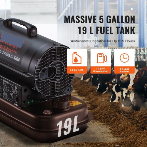 Heating for Wide Workspace: This forced-air kerosene heater delivers 70,000 BTUs of heat, instantly warming up spaces like your workspace, barn, workshop, farm, or indoor areas up to 14,125.9 cuft / 400 m3. It ensures efficient equipment operation and worker comfort.