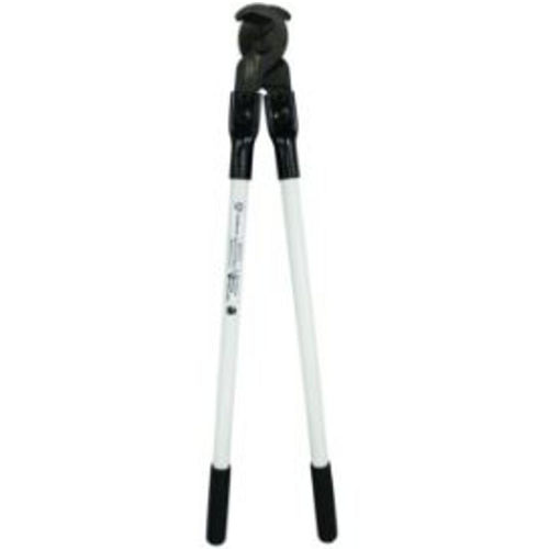 Strong and lightweight shearing cable cutter with fiberglass handles that work quickly in two ways, the curved blade jaws hold cable while blades make efficient clean cuts.
