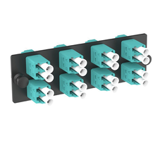 The panel accommodates LC duplex adapters, often in a high-density layout. It may include labeling areas for easy identification and management of connections.