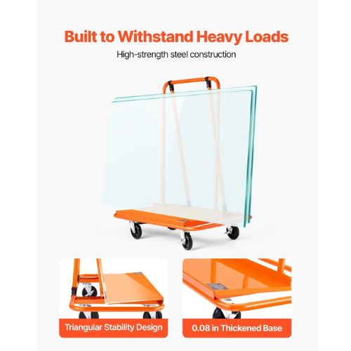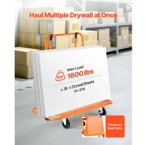 This drywall dolly cart supports up to 1800 lbs. The 15° tilt base keeps panels stable, ideal for moving dozens of drywall sheets or large tables with ease and security