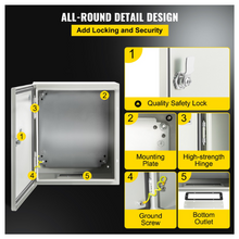 The electric enclosure box is made of high-quality carbon steel. Precise lock design, high-strength hinges, sealing strips, and IP66 protection grade are all used to protect your plug-ins, power cords, and other equipment from the influence of the weather. Therefore, to ensure the circuit protected from liquids and corrosion.