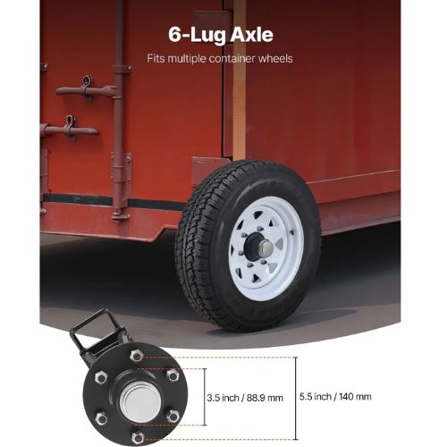 The axle features a 5.5 in (140 mm) bolt circle and a 3.5 in (88.9 mm) hub bore. The shipping container wheels kit’s precise design ensures firm installation and fits various shipping container wheels with ease