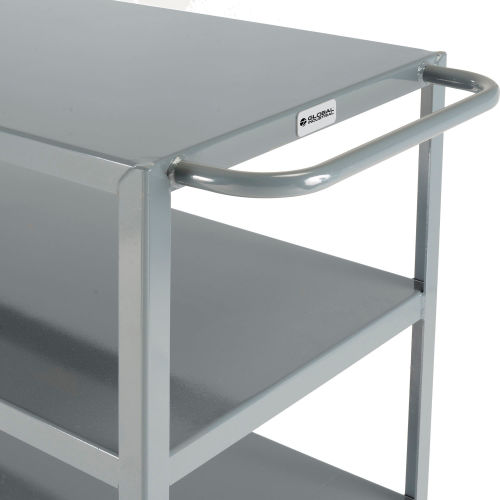 Get inventory rolling faster with better steering and support. This Global Industrial. All Welded Service Cart simplifies transportation of heavy equipment and materials throughout your facility. Heavy-duty 12 gauge shelves and 10 gauge corner posts each have a durable gray powder coated finish. The smooth and flat flush shelf design provides a convenient work surface and allows for easy loading/unloading of heavy objects. The push/pull steel handle provides an additional 5" to the overall length of cart allowing the user to easily grip and steer with comfort.