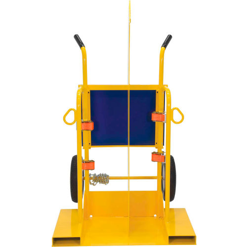 This handy truck is designed to carry welding cylinders, hoses and a cutting torch in a single trip. Each cart includes two tank compartments, (1) 13-3/8"W and (1) 10-7/16"W, with ratcheting straps to retain oxygen and acetylene cylinders, and brackets are included for holding a torch and hoses. Twin ergonomic handles and oversized 16" diameter foam-filled wheels offer tilt-and-go portability. Convenient open-top tray is included for storing welding accessories. All-welded steel construction with a durable safety-yellow enamel finish. Shipped assembled.